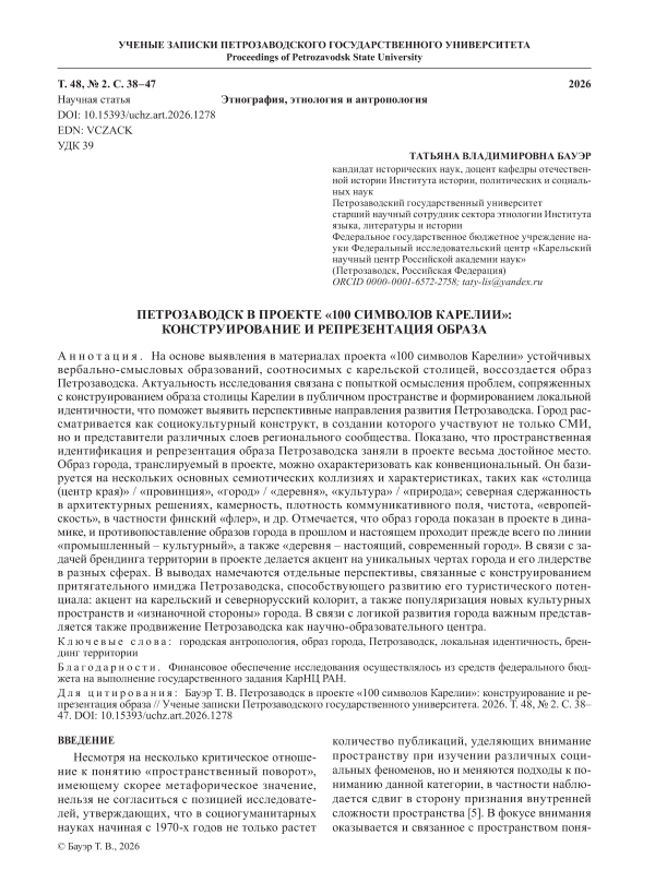 На основе выявления в материалах проекта «100 символов Карелии» устойчивых вербально-смысловых образований, соотносимых с карельской столицей, воссоздается образ Петрозаводска. Актуальность исследования связана с попыткой осмысления проблем, сопряженных с конструированием образа столицы Карелии в публичном пространстве и формированием локальной идентичности, что поможет выявить перспективные направления развития Петрозаводска. Город рассматривается как социокультурный конструкт, в создании которого участвуют не только СМИ, но и представители различных слоев регионального сообщества. Показано, что пространственная идентификация и репрезентация образа Петрозаводска заняли в проекте весьма достойное место. Образ города, транслируемый в проекте, можно охарактеризовать как конвенциональный. Он базируется на нескольких основных семиотических коллизиях и характеристиках, таких как «столица (центр края)» / «провинция», «город» / «деревня», «культура» / «природа»; северная сдержанность в архитектурных решениях, камерность, плотность коммуникативного поля, чистота, «европейскость», в частности финский «флер», и др. Отмечается, что образ города показан в проекте в динамике, и противопоставление образов города в прошлом и настоящем проходит прежде всего по линии «промышленный – культурный», а также «деревня – настоящий, современный город». В связи с задачей брендинга территории в проекте делается акцент на уникальных чертах города и его лидерстве в разных сферах. В выводах намечаются отдельные перспективы, связанные с конструированием притягательного имиджа Петрозаводска, способствующего развитию его туристического потенциала: акцент на карельский и севернорусский колорит, а также популяризация новых культурных пространств и «изнаночной стороны» города. В связи с логикой развития города важным представляется также продвижение Петрозаводска как научно-образовательного центра.