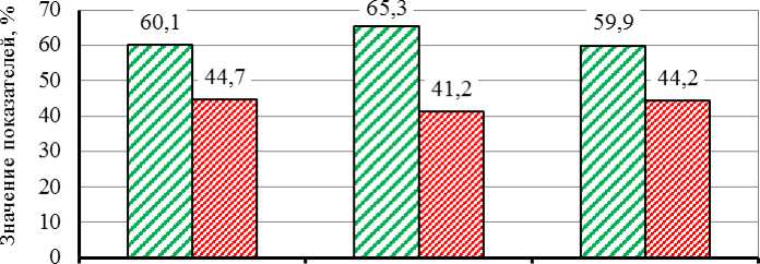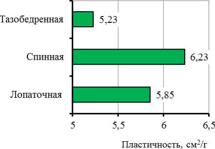 Данные, представленные на рисунках 4 и 5, показали, что образцы мышц тазобедренной части туши характеризовались повышенным значением усилия резания (5,1×102 Н/м) и наименьшим значением пластичности (5,23 см2/г). Этот факт может быть связан с более развитой соединительной тканью в виде сухожилий и связок, которые обеспечивают сократительную способность мышц.