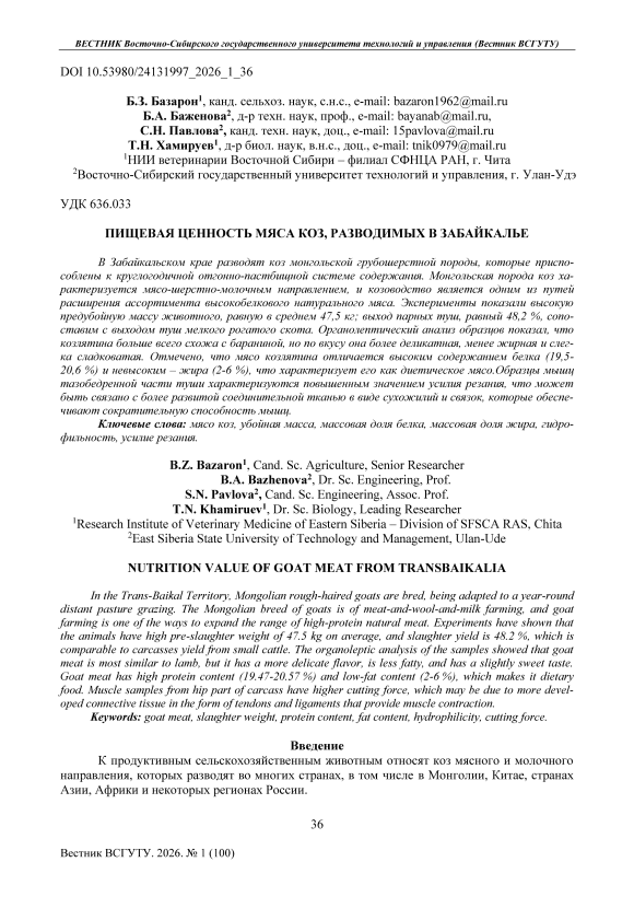 In the Trans-Baikal Territory, Mongolian rough-haired goats are bred, being adapted to a year-round distant pasture grazing. The Mongolian breed of goats is of meat-and-wool-and-milk farming, and goat farming is one of the ways to expand the range of high-protein natural meat. Experiments have shown that the animals have high pre-slaughter weight of 47.5 kg on average, and slaughter yield is 48.2 %, which is comparable to carcasses yield from small cattle. The organoleptic analysis of the samples showed that goat meat is most similar to lamb, but it has a more delicate flavor, is less fatty, and has a slightly sweet taste. Goat meat has high protein content (19.47-20.57 %) and low-fat content (2-6 %), which makes it dietary food. Muscle samples from hip part of carcass have higher cutting force, which may be due to more developed connective tissue in the form of tendons and ligaments that provide muscle contraction.