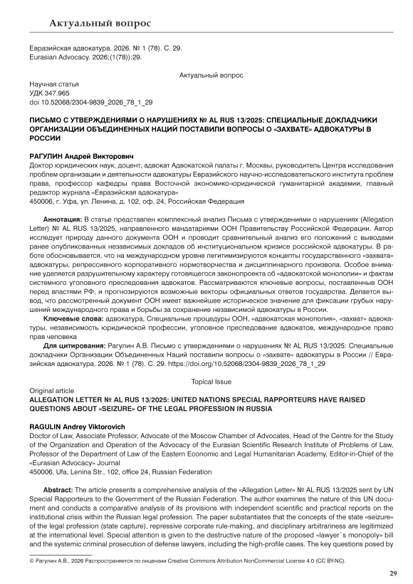 The article presents a comprehensive analysis of the «Allegation Letter» № AL RUS 13/2025 sent by UN Special Rapporteurs to the Government of the Russian Federation. The author examines the nature of this UN document and conducts a comparative analysis of its provisions with independent scientific and practical reports on the institutional crisis within the Russian legal profession. The paper substantiates that the concepts of the state «seizure» of the legal profession (state capture), repressive corporate rule-making, and disciplinary arbitrariness are legitimized at the international level. Special attention is given to the destructive nature of the proposed «lawyer`s monopoly» bill and the systemic criminal prosecution of defense lawyers, including the high-profile cases. The key questions posed by the UN to the Russian authorities are considered, and the potential vectors of official state responses are forecasted. It is concluded that the examined UN document has paramount historical significance for documenting gross violations of international law and for the ongoing struggle to preserve an independent legal profession in Russia.