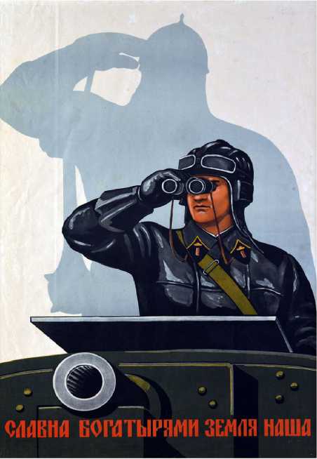 Многие художники, задумывая идеи своих плакатов, отталкивались от цитаты из речи И.В. Сталина, произнесенной на знаменитом параде на Красной площади 7 ноября 1941 г.: «Пусть вдохновляет вас в этой войне мужественный образ наших великих предков – Александра Невского, Дмитрия Донского, Кузьмы Минина, Дмитрия Пожарского, Александра Суворова, Михаила Куту-зова»1. Образы этих героев прошлого появились на плакатах – чаще всего в виде теней за фигурами советских солдат (рис. 2, 3а) или памятников (памятник Минину и Пожарскому И. Мартоса на Красной площади на плакате В. Корецкого «Наши силы неисчислимы»).