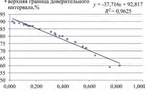 Рис. Зависимость между долей отклонения количества отбираемых проб от рекомендуемых значений и верхней доверительной границей массива получаемых данных о продукции
