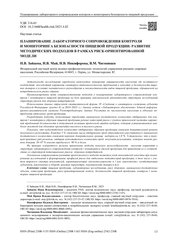Актуальность исследования определена важностью повышения защищенности населения от негативного воздействия последствий нарушения санитарно-эпидемиологических требований к качеству и безопасности пищевых товаров в условиях значительного разнообразия и множественности видов пищевой продукции, обращаемой на потребительском рынке страны. Проанализированы пути совершенствования подходов к планированию лабораторного сопровождения контроля / мониторинга пищевой продукции на базе принципа максимальной адекватности структуры исследований структуре рисков для здоровья потребителей. Использованы данные отраслевой статистической формы 18 «Сведения о санитарном состоянии субъекта Российской Федерации» (раздел 8) за 2014–2023 гг.; данные модуля «Лабораторное обеспечение» Единой информационно-аналитической системы Роспотребнадзора; данные Росстата по численности населения и объемам потребления отдельных групп продукции. Разработаны подходы, позволяющие определять минимально достаточное количество отбираемых для контроля / мониторинга образцов пищевой продукции разных категорий риска с учетом приемлемой частоты нарушений требований безопасности и допустимой величины предельной ошибки выборки, которая устанавливается наиболее жесткой для объектов чрезвычайно высокого и высокого риска. Показано, что недостаточное количество отбираемых образцов продукции снижает доверительный уровень получаемого результата. Каждые 5 % снижение числа отбираемых проб относительно рассчитанного минимально достаточного количества снижают верхнюю доверительную границу выборки на 1,8 %. Установлено, что в текущей практике ряд регионов, отбирая недостаточное количество проб, получает результаты, которые имеют уровень доверия 50–87 % вместо требуемого 90 % и более. На примере конкретного региона применение подхода показало целесообразность внесения корректив в структуру лабораторного сопровождения контроля / мониторинга мясной продукции для приведения ее в соответствие со структурой потенциальных рисков здоровью потребителей. Основными направлениями развития предложенного подхода являются учет показателей качества при планировании исследований и формирование профилей риска для отдельных подкатегорий продукции, в том числе с учетом широкого спектра показателей, характеризующих законопослушность и / или «рисковость» хозяйствующих субъектов, вовлеченных в оборот, ценовые параметры, покупаемость товара и т.п.