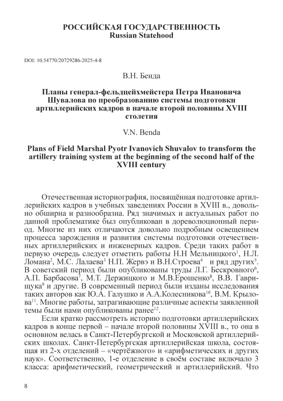 Отечественная историография, посвящённая подготовке артиллерийских кадров в учебных заведениях России в XVIII в., довольно обширна и разнообразна. Ряд значимых и актуальных работ по данной проблематике был опубликован в дореволюционный период. Многие из них отличаются довольно подробным освещением процесса зарождения и развития системы подготовки отечественных артиллерийских и инженерных кадров. Среди таких работ в первую очередь следует отметить работы Н.Н Мельницкого1, Н.Л. Ломана2, М.С. Лалаева3 Н.П. Жервэ и В.Н.Строева4 и ряд других5. В советский период были опубликованы труды Л.Г. Бескровного6, А.П. Барбасова7, М.Т. Держицкого и М.В.Ерошенко8, В.В. Гаври-щука9 и другие. В современный период были изданы исследования таких авторов как Ю.А. Галушко и А.А.Колесникова10, В.М. Крыло-ва11. Многие работы, затрагивающие различные аспекты заявленной темы были нами опубликованы ранее12.