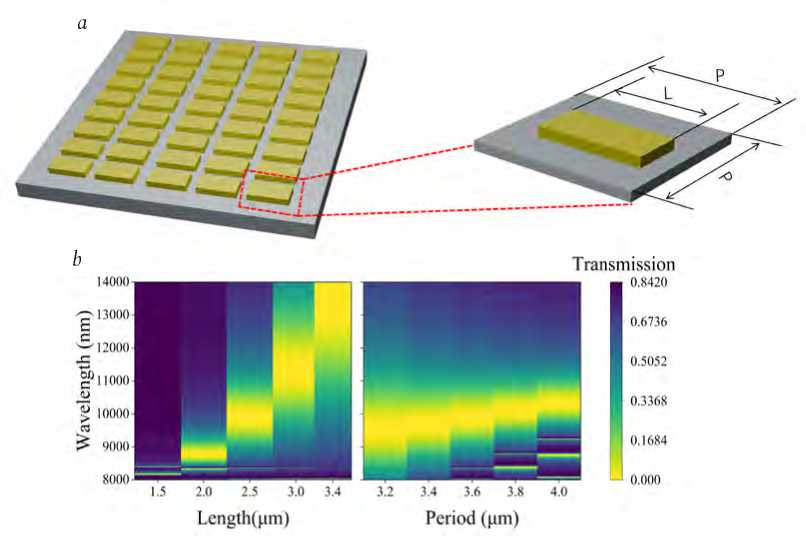 We have fabricated the proposed plasmonic metasurface arrays on double-side-polished 12,5-mm-thick ZnSe substrates. The fabrication process commenced with spin-coating a resist layer (PMMA A-7, 400 nm thick) onto the substrate, followed by patterning the resist via electron-beam lithography. Subsequently, a 5-nm-thick Ti adhesion layer was deposited prior to the evaporation of a 100 nm-thick Au film using e-beam evaporation techniques. Finally, lift-off was accomplished by immersing the sample in acetone for several hours, followed by ultrasonic cleaning to remove the resist and overlying Au metallization. The fabricated metasurface sample with its microscopic structural morphology is presented in Fig. 3, a . The Fig. 3, b presents a set of spectra corresponding to different unit lengths under the same period in the metasurface sample, which is in broad agreement with the simulation results.