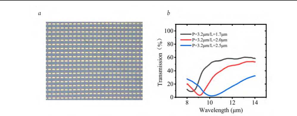 Fig. 3. ( a ) Microscopic structural morphology of the fabricated metasurface sample. ( b ) Corresponding FTIR transmission spectra of three metasurface arrays