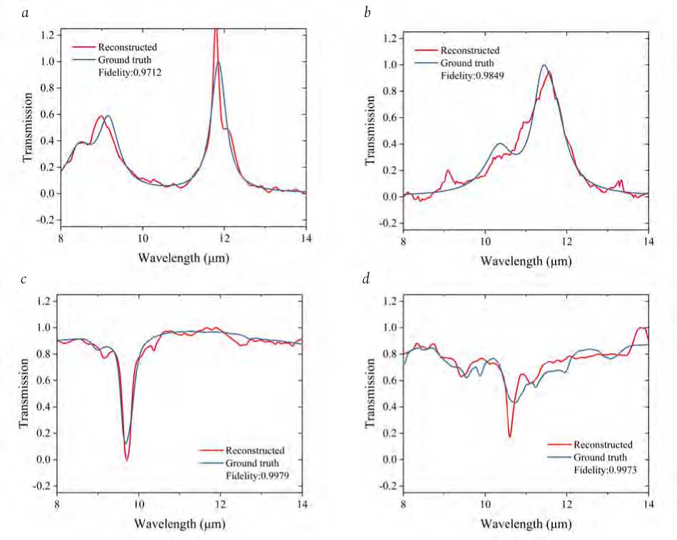 To evaluate the spectrometer’s reconstruction performance, we reconstructed some random spectra in the 8–14 μm range using two distinct sets of transmission spectra modulated by the metasurface. The reconstruction results are presented in Fig. 4, a–b, where blue and red lines represent the ground truth and reconstructed spectra, respectively. As evidenced by the fidelity values exceeding 97 % for both polarized and unpolarized spectral reconstructions, our approach demonstrates robust accuracy in reconstructing stochastic spectra across the operational bandwidth.