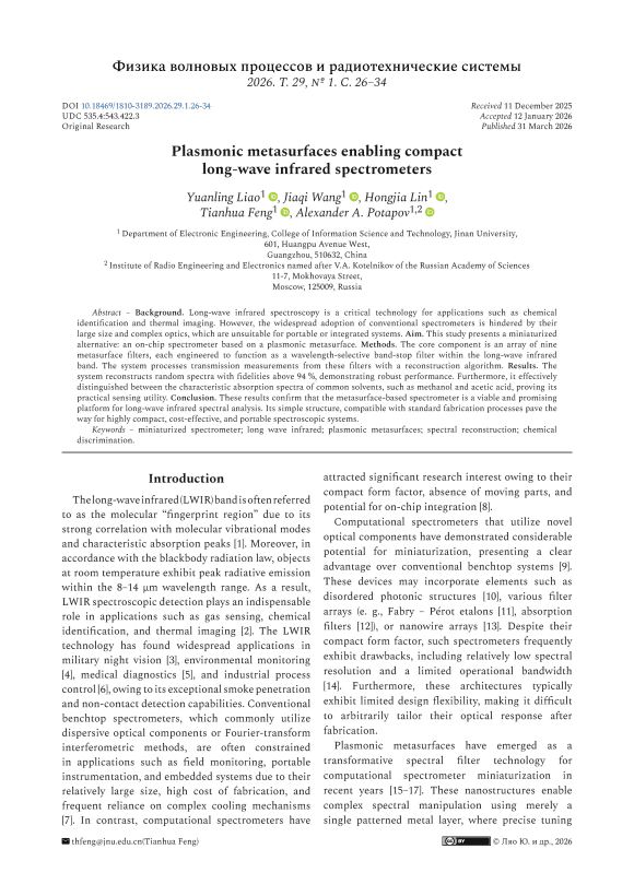 Обоснование. Длинноволновая инфракрасная спектроскопия является ключевой технологией для таких приложений, как идентификация химических веществ и тепловое изображение. Однако широкое распространение традиционных спектрометров затруднено их большими габаритами и сложной оптикой, что делает их неподходящими для портативных или интегрированных систем. Цель. В этом исследовании представлен миниатюрный аналог: спектрометр на чипе на основе плазмонной метаповерхности. Методы. Основным компонентом является массив из девяти фильтров на метаповерхности, каждый из которых разработан как избирательный полосно-отражающий фильтр в диапазоне длинноволновых инфракрасных волн. Система обрабатывает измерения пропускания этих фильтров с помощью алгоритма реконструкции. Результаты. Система восстанавливает случайные спектры с точностью выше 94 %, демонстрируя надежную работу. Более того, она эффективно различала характерные спектры поглощения распространенных растворителей, таких как метанол и уксусная кислота, что подтверждает ее практическую полезность для сенсорики. Заключение. Эти результаты подтверждают, что спектрометр на основе метаповерхности является жизнеспособной и перспективной платформой для спектрального анализа в диапазоне длинноволновых инфракрасных волн. Его простая структура, совместимая со стандартными процессами изготовления, прокладывает путь к созданию компактных, экономичных и портативных спектроскопических систем.