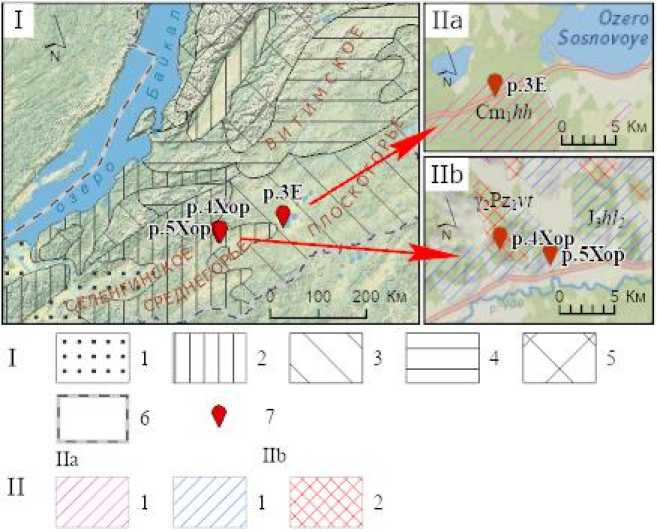Fig. 1. Location of the research object. I – geocryological zoning. 1 – isolated patches (< 10% of area), depth < 15 m, T ave from 4 to –0.5 °С; 2 – sporadic (10–15% of area), depth < 50 м, T ave from 2 to –1.5 °С; 3 – discontinuous (50–80% of area), depth 50–200 m, T ave from 1 to –3 °С; 4 – discontinuous (80–95 % of area), depth 100–300 m, T ave from – to –5 °С; 5 – continuous, depth 300–500 m and over, T ave from –3 to –7 °С or less; 6 – border of the Russian Federation; 7 – soil pits. II – geological maps. IIa – The Darkhitui area. 1 – Lower Cambrian: the Khokhurt suit. Basic metaeffusive rocks, volcanogenic-pyroclastic rocks, marbled limestones, metamorphic shales, sandstones. IIb – The Bulum area. 1 – Upper Jurassic. The Khilok suite. Upper subsuite. Trachybasalts, subalkaline basalts, plagiobasalts; 2 – Early Paleozoic intrusions. Phase II. Leucocratic biotite, less commonly two-mica granites (γ2); microgranite dikes (γ2), pegmatite veins (ρ2).