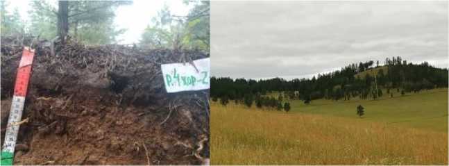Ключевой участок “Дархитуй”. Разрез 3Е заложен в привершинной части горы Дархитуй с отметкой 1017 м, в ~8 км на запад от с. Сосново-Озерское. Координаты: 52°31'04.7" N, 111°26'02.3" Е. Вершина выположена, уклон ~1–2° на запад. В микрорельефе приствольные повышения и западинки.