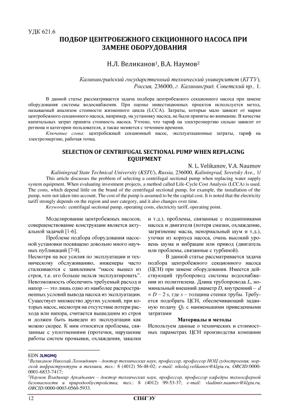 В данной статье рассматривается задача подбора центробежного секционного насоса при замене оборудования системы водоснабжения. При оценке инвестиционных проектов используется метод, называемый анализом стоимости жизненного цикла (LCCA). Затраты, которые мало зависят от марки центробежного секционного насоса, например, на установку насоса, не были приняты во внимание. В качестве капитальных затрат принята стоимость насоса. Учтено, что тариф на электроэнергию сильно зависит от региона и категории пользователя, а также меняется с течением времени.