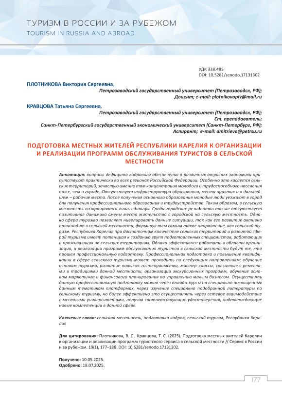Вопросы дефицита кадрового обеспечения в различных отраслях экономики присутствуют практически во всех регионах Российской Федерации. Особенно это касается сельских территорий, зачастую именно там концентрация молодого и трудоспособного населения ниже, чем в городе. Отсутствует инфраструктура образования, места практик и в дальнейшем – рабочие места. После получения основного образования молодые люди уезжают в город для получения профессионального образования и трудоустройства. Таким образом, в сельскую местность возвращаются лишь единицы. Среди городских резидентов также отсутствует позитивная динамика смены места жительства с городской на сельскую местность. Однако сфера туризма позволяет нивелировать данные ситуации, так как его развитие активно происходит в сельской местности, формируя тем самым такое направление, как сельский туризм. Республика Карелия при достаточном количестве сельских территорий и развитой сферой туризма имеет потенциал к созданию групп подготовленных специалистов, работающих и проживающих на сельских территориях. Однако эффективнее работать в области организации, и реализации программ обслуживания туристов в сельской местности будут те, кто прошел профессиональную подготовку. Профессиональная подготовка и повышение квалификации в сфере сельского туризма может проходить по следующим направлениям: обучение основам туризма, развитие навыков гостеприимства, мастерклассы, связанные с ремеслами и традициями данной местности, организации экскурсионных программ, обучение основам маркетинга и финансового планирования по управлению малым бизнесом. Осуществить данную профессиональную подготовку можно через онлайнкурсы на специально посвященных данным тематикам платформах, через изучение специально подобранной литературы по сельскому туризму, но более эффективно это осуществлять через сетевое взаимодействие с местными университетами, получая соответствующие удостоверения, подтверждающие новые компетенции в данной сфере.