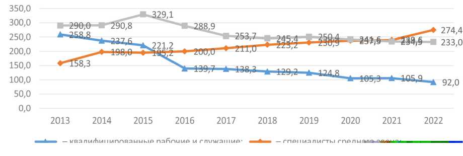 Рассмотрим статистику выпуска инженеров. Анализ статистики (по укрупненным группам специальностей) показывает, что в 2023 г. прирост выпускников сократился почти на 5 % по сравнению с 2018 г. [22]. В динамике можно заметить устойчивое сокращение выпуска как бакалавров, магистров и специалистов в целом, так и инженеров (с 290 тыс. чел. в 2013 г. до 229,7 тыс. чел. в 2023 г.), а также сокращение выпуска инженеров уровня СПО (рис. 2). При этом наблюдается рост выпуска специалистов среднего звена по инженерно-техническим специальностям.