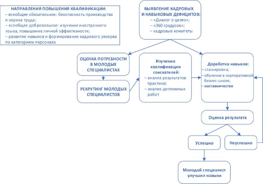 Анализ публичных корпоративных документов и СМИ позволяет описать модель дополнительного образования молодых специалистов, интегрированную в общую систему управления результативностью персоналом (рис. 4). Среди практик дополнительного образования отдельное внимание уделяется наставничеству, которое является обязательным компонентом производственного процесса [32; 33]. Главная цель наставничества – повышение производительности труда. За молодым специалистом закрепляется наставник, кото-рый до 40 % своего рабочего времени уделяет взаимодействию с подчиненным. Некоторые наставники полностью освобождены от основных обязанностей и посвящают рабочее время молодым сотрудникам. За совместной работой сокращаются потери производственных процессов – рабочего времени, простоя оборудования, расхода сырья и т. д. [34; 35]. Такая