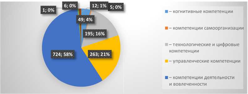 1255 вакансий от ПАО «Северсталь» (рис. 5). Технологические навыки требовались для 16 % вакансий. Наиболее востребованными были компетенции, ориентированные на сервис и обслуживание клиентов. Востребованы также управленческие компетенции, связанные с управлением человеческими ресурсами и эксплуатацией бизнес-процессов, а также когнитивные компетенции, такие как аналитическое мышление. Результаты исследования говорят о том, что ПАО «Северсталь» на текущем этапе развития нуждается в компетенциях вовлеченности. Данные компетенции позволяют эффективно организовать длительное сотрудничество с клиентами и создание прочных бизнес-процессов [37]. Фокус внимания на данных компетенциях неслучаен. В 2022 г. компания столкнулась с необходимостью переориентировать экспортные объемы металлопродукции на внутренний рынок и страны СНГ, возникла потребность в локализации отдельных производств и импортозамещении оборудования [38; 39].