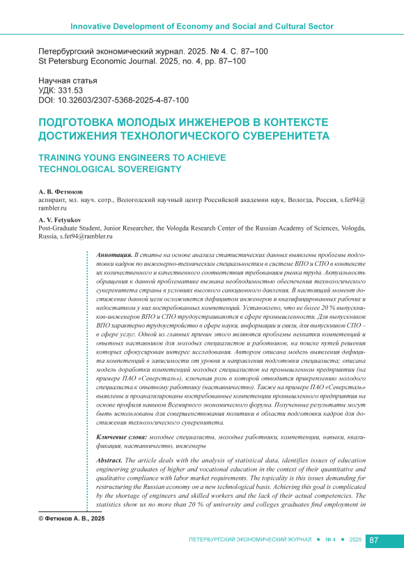 В статье на основе анализа статистических данных выявлены проблемы подготовки кадров по инженерно-техническим специальностям в системе ВПО и СПО в контексте их количественного и качественного соответствия требованиям рынка труда. Актуальность обращения к данной проблематике вызвана необходимостью обеспечения технологического суверенитета страны в условиях высокого санкционного давления. В настоящий момент достижение данной цели осложняется дефицитом инженеров и квалифицированных рабочих и недостатком у них востребованных компетенций. Установлено, что не более 20 % выпускников-инженеров ВПО и СПО трудоустраиваются в сфере промышленности. Для выпускников ВПО характерно трудоустройство в сфере науки, информации и связи, для выпускников СПО – в сфере услуг. Одной из главных причин этого являются проблемы нехватки компетенций и опытных наставников для молодых специалистов и работников, на поиске путей решения которых сфокусирован интерес исследования. Автором описана модель выявления дефицита компетенций в зависимости от уровня и направления подготовки специалиста; описана модель доработки компетенций молодых специалистов на промышленном предприятии (на примере ПАО «Северсталь»), ключевая роль в которой отводится прикреплению молодого специалиста к опытному работнику (наставничество). Также на примере ПАО «Северсталь» выявлены и проанализированы востребованные компетенции промышленного предприятия на основе профиля навыков Всемирного экономического форума. Полученные результаты могут быть использованы для совершенствования политики в области подготовки кадров для достижения технологического суверенитета.