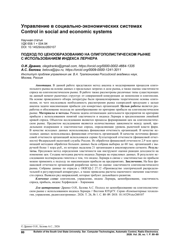 В данной работе представлен метод анализа и моделирования процессов олигопольного рынка на основе данных о предельных затратах и доле рынка, а также оценка эластичности спроса на олигополистическом рынке. В работе также рассмотрены различные типы существующих на данный момент рыночных структур: от совершенной конкуренции до монополии и олигополии. На основе проведенного обзора литературы были проанализированы теоретические основы олигополии, из чего последовала необходимость рассмотрения рынка однородной продукции с целью анализа задачи максимизации прибыли для конкретных организаций. Целью работы является разработка и обоснование подхода по ценообразованию по критерию прибыли на олигополистическом рынке. Материалы и методы. Решена задача оптимизации деятельности предприятия по критерию прибыли с использованием понятий эластичности и индекса Лернера в предположении линейной кривой спроса. Объектом исследования являются процессы формирования цен на олигополистическом рынке. Предметом исследования являются количественные зависимости между ценой, предельными издержками и эластичностью спроса, определяющие уровень рыночной власти фирм. В качестве исходных данных использовалась финансовая отчетность организаций. В качестве исходных данных использовалась финансовая отчетность организаций. В качестве источника финансовой отчетности организаций использовался сервис бухгалтерской отчетности (финансовой отчетности) Федеральной налоговой службы России. Из обработки финансовой отчетности 2,9 млн организаций методами обработки больших данных была собрана выборка до 60 тыс. организаций с выручкой более 1 млрд руб., из которых выделена 21 организация в анализируемом сегменте. Результаты. Предложен метод определения эластичности как инструмент оценки реакции доходности на изменение цен. Создана методика расчета индекса Лернера на отраслевых данных. В результате исследования подтверждена гипотеза о том, что индекс Лернера в связке с эластичностью по прибыли можно применять к подходу по максимизации прибыли на предприятиях. Заключение. На базе финансовой отчетности организаций разработан метод по оценке эластичности олигополистического рынка. Собраны данные по отрасли с ОКВЭД-2 27.12 «Производство электрической распределительной и регулирующей аппаратуры», а также приведены расчеты оценочного значения эластичности спроса. Выявлен ряд направлений, которые требуют дальнейшего развития.