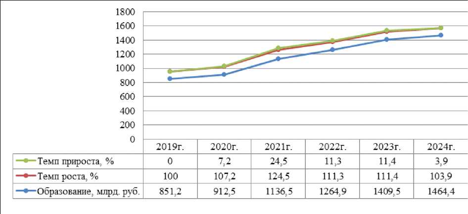В рамках исследования динамики финансирования образовательной сферы в Российской Федерации за период с 2019 по 2024 годы был проведен анализ данных, предоставленных Федеральным казначейством РФ, о бюджетных ассигнованиях. В ходе исследования осуществлялась оценка темпов роста и прироста финансовых ресурсов, направляемых на нужды образования, с использованием официальных статистических материалов (рисунок 1).