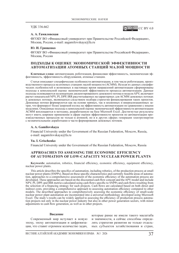 Статья описывает специфические особенности автоматизации, в том числе роботизации, производственного процесса на атомных станциях малой мощности (АСММ). Исходя из данных специфических особенностей и возможных в настоящее время направлений автоматизации сформированы подходы к комплексной оценке экономической эффективности процесса автоматизации. Данные подходы основываются на концепции дисконтированного денежного потока и модели APV, включают расчет показателей NPV, PI, DPP, IRR рассчитываемых на характерных для АСММ денежных потоках и денежных потоках, являющихся следствием подбора стратегии финансирования таких проектов. Денежные потоки формируются как на основе прямых, так и косвенных и внереализационных затрат, что формирует более широкий взгляд на эффективность автоматизации по сравнению с иными моделями. Описанные подходы к комплексной оценке экономической эффективности автоматизации АСММ воплощаются в методику, разработанную на базе Microsoft Excel. Достигнутые результаты могут иметь широкое применение в сфере оценки эффективности проектов по автоматизации производственных процессов не только в атомной, но и в других сферах генерации электроэнергии с незначительными доработками в части формирования денежных потоков.