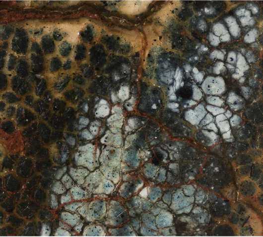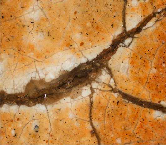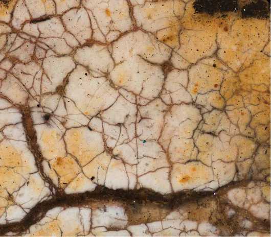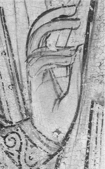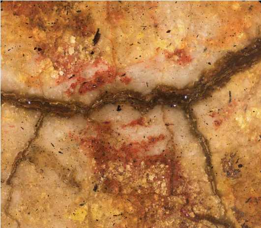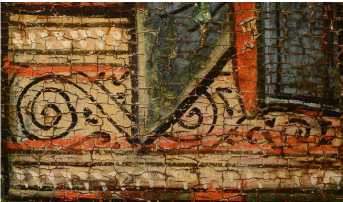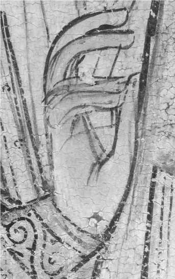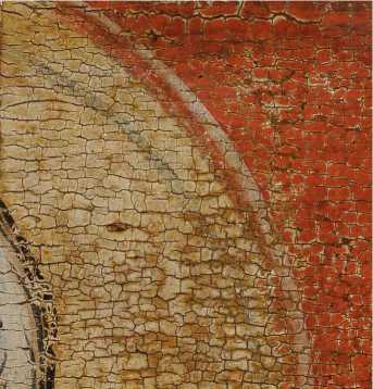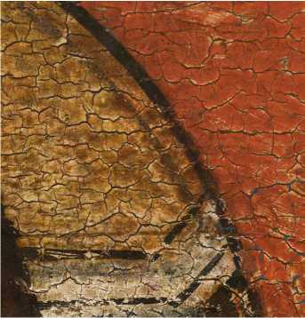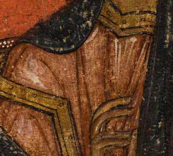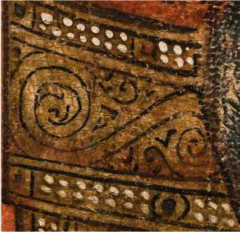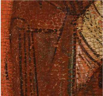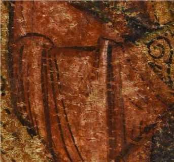 На нижней части престола Христа по слою аурипигмента выполнен орнамент, а в теневых частях нанесены лессировки кирпично-красного оттенка, после чего на всю поверхность положен полупрозрачный слой более сложного по пигментному составу коричневато-кирпичного колера (красная карбонатная охра, уголь, киноварь и коричневый железосодержащий пигмент). Особый интерес представляет изображение правой нижней ножки престола — орнамент здесь первоначально был дан в меньшем масштабе, но затем подвергся авторской переделке — «неудачный» фрагмент был перекрыт очень тонким слоем левкаса, по которому был сделан новый орнамент необходимого размера, а также заново выполнены все этапы лессировок ( ил. 7 ). Эта особенность сейчас видна невооруженным глазом из-за слабой плотности промежуточного слоя левкаса. Аналогичная авторская правка, но меньшего размера, присутствует также на левой ножке престола и на гиматии правого Ангела. Для орнаментированной ткани, подвешенной к верхней планке спинки престола, использована красочная смесь коричневого оттенка (желтая охра, уголь, темно-красная (некарбонатная) охра, включения мелких частиц светлого глауконита и коричневого железосодержащего пигмента). Все детали седалища украшены фактурными белильными точками, нанесенными в два ряда * 8.