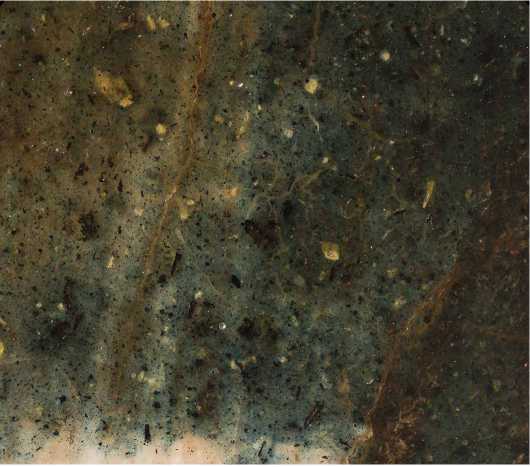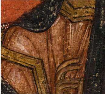 Позем написан смесью синего цвета, составленной из индиго и угля с добавкой аурипигмента ( ил. 6 а ). Разбавленная краска наносилась мягкой кистью слегка неравномерно. Для всех деталей охристого цвета, имитирующего золото (нимбы, престол, Евангелие, крылья ангелов, декоративные элементы одежд и доспехов) использован крупнотертый аурипигмент с небольшими добавками угля и коричневого железосодержащего пигмента, наносившийся по подложке кирпичного цвета ( ил. 6 б ).