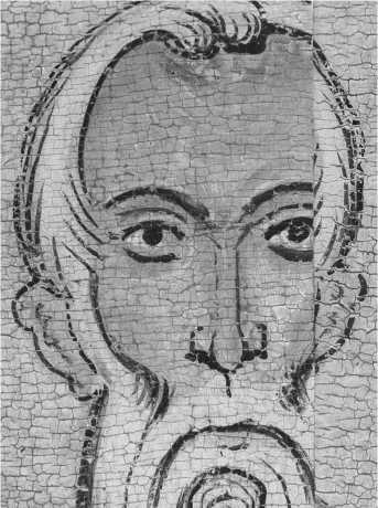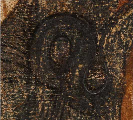 Между этапами подготовительного слоя и охрения простой угольной краской выполнен основной рисунок ( ил. 17 б ). Художник работал кистью с различным нажимом, немного неаккуратно, линии не всегда точно соответствовали форме и местами многократно подправлялись мастером, не придававшим значения просматриваемости этих «правок» сквозь тонкие слои последующей моделировки. К специфическим авторским особенностям можно отнести также прерывистость некоторых линий и такие приемы, как поперечный межбровный штрих на переносице и «галочка» над ней, дополнительный легкий мазок у внешнего края правого глаза, двойные, чуть расходящиеся линии бровей и подглазных теней, а также своеобразная форма ноздрей и нижней губы, намеченной снизу двумя раздельными киноварными мазками.