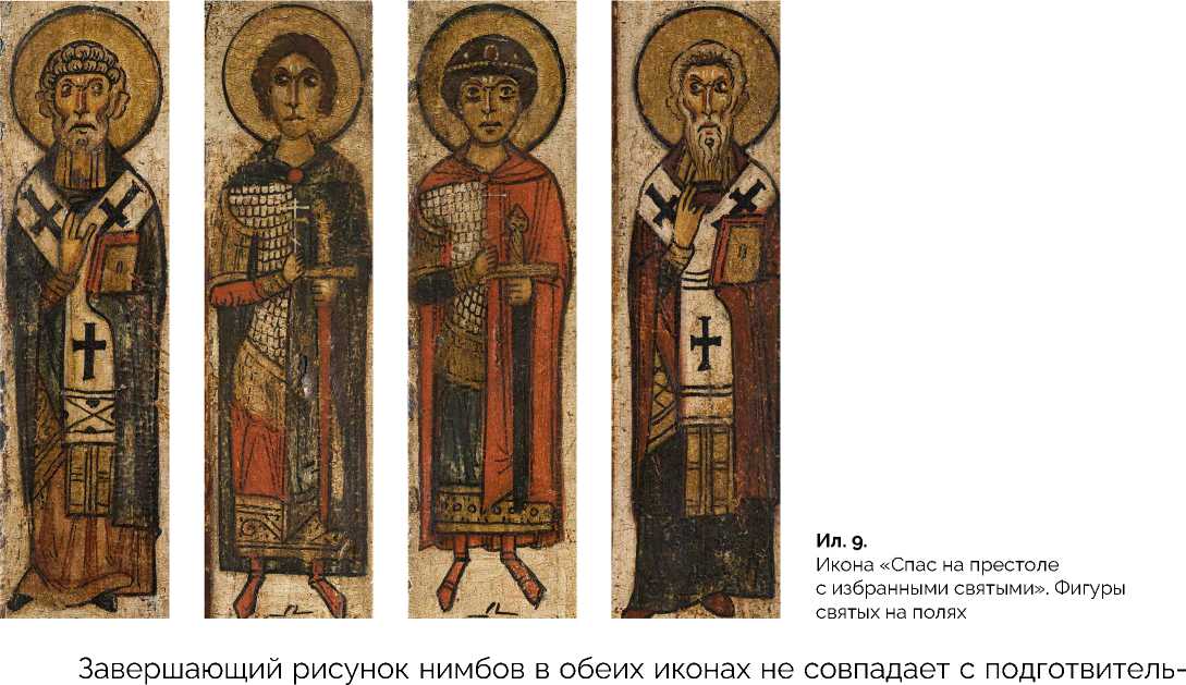 При написании образов на полях иконы ( ил. 9 ) художник придерживался в целом такой же системы, как и на основном изображении, — помимо похожих красочных смесей, здесь можно увидеть те же характерные приемы их нанесения и относительно свободную последовательность этапов работы. Изображения воинских кольчуг и омофоров святителей выполнены свинцовыми белилами. Некоторым разнообразием отличаются смеси синего оттенка, основным компонентом которых также является индиго, но на изображении хитона святого Георгия в составе присутствуют очень мелкие включения натурального азурита.