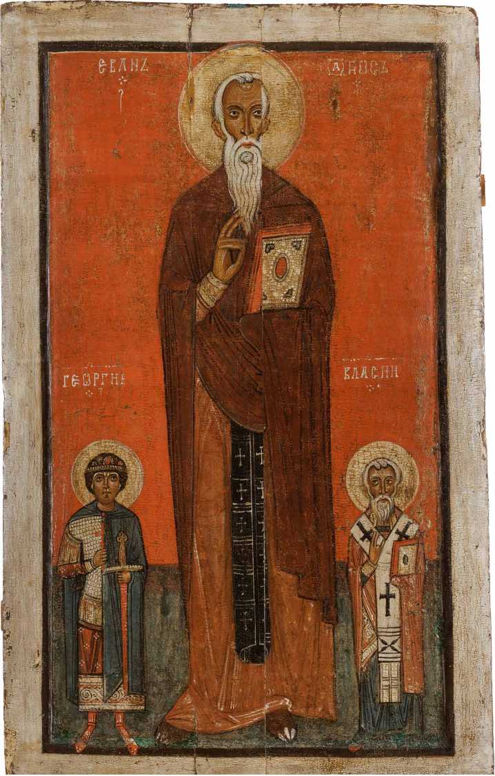 В научной среде еще с 1940-х годов3 существует устойчивое мнение о значительной близости этой иконы с образом «Преподобный Иоанн Лествичник, великомученик Георгий и священномученик Власий» ( ил. 2 ), имеющей то же происхождение (Н. Г. Порфиридов ссылается на устное свидетельство Г. О. Чирикова)4, но более сложную судьбу, и с 1933 года находящейся в собрании Русского музея *** .