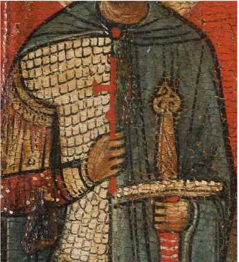 Фрагменты изображений доспехов на фигурах великомучеников: а — икона «Спас на престоле с избранными святыми». Великомученик Георгий. Фрагмент; б — икона «Преподобный Иоанн Лествичник, великомученик Георгий и священномученик Власий».