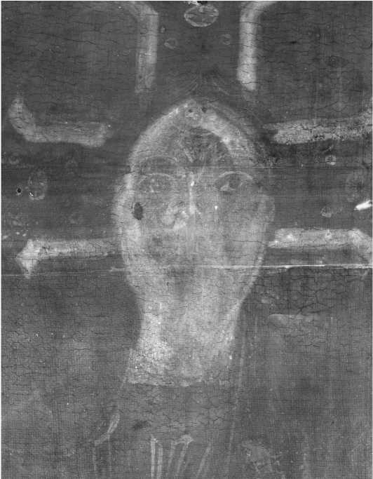 Личное письмо на обеих иконах представляет особый интерес с точки зрения последовательности работы мастера. Как показало исследование, до первого слоя охристого оттенка, соответствующего этапу санкирной подготовки, был положен слой свинцовых белил с единичными включениями натурального азурита. Местами эта красочная смесь нанесена густо, за счет чего заметна невооруженным глазом (например, на изображениях ног Христа). В большинстве случаев белильная подготовка выполнена небрежно, неравномерно наполненной кистью, что лучше всего заметно на рентгенограмме (ил. 16).