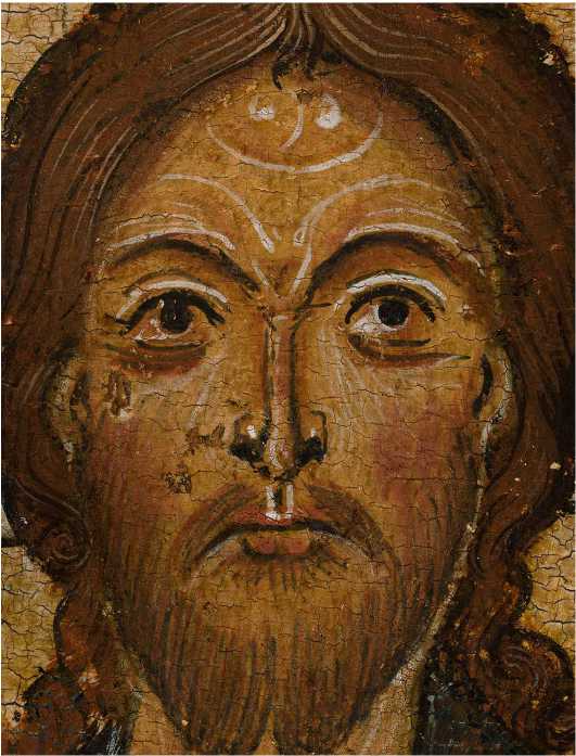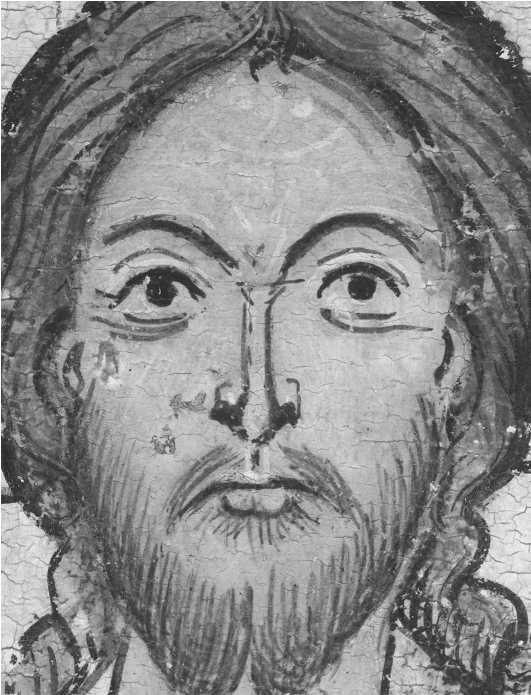 Икона «Спас на престоле с избранными святыми». Христос. Фрагмент. Съемка: а — в видимом свете; б — в инфракрасной обрасти спектра