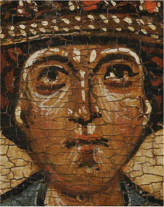 Изображения ликов великомученика Георгия: а — икона «Спас на престоле с избранными святыми»;