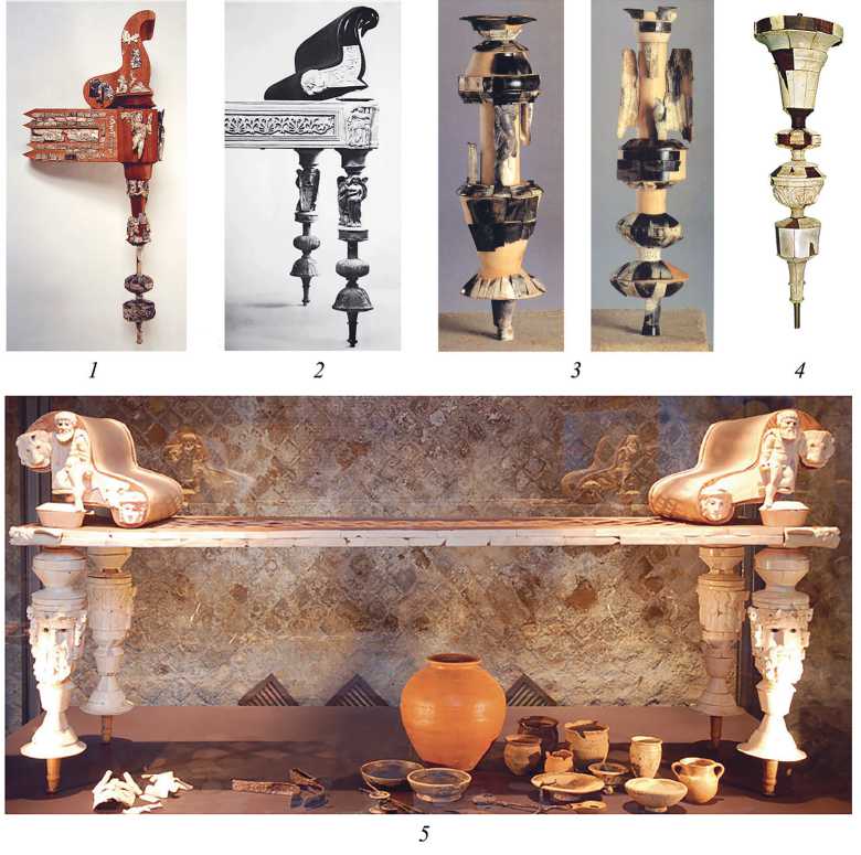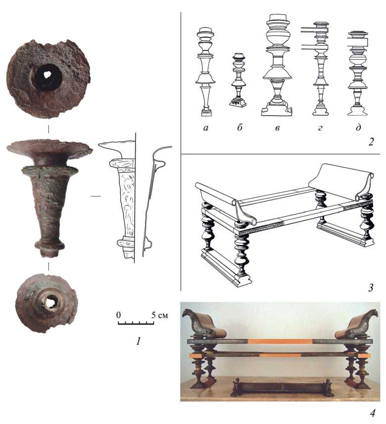1 – фрагмент бронзовой ножки из Херсонеса; 2 – схемы ножек лож из Махдии (а), Помпей (б), Марокко (в), Каноса (г), Бургуэн-Жалье (е) (по: Boucher , 1982); 3 – реконструкция ложа из Бургуэн-Жалье (по: Ibid . ); 4 – погребальное ложе с бронзовыми ножками, музей Чентрале Монтемартини (по: Cormier , 2022)