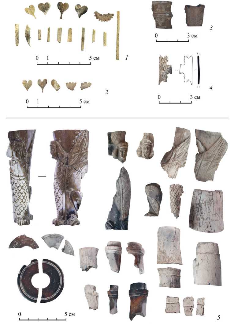 Объект 44 представлял собой также типичную площадку для кремации. В составе инвентаря было обнаружено более 350 фрагментов резных пластин из слоновой кости (рис. 2: 5 ). Все они имеют следы термического воздействия (почернение, деформация, трещины), что указывает на пребывание материала в зоне горения. Значительная часть фрагментов обуглена, отдельные элементы сильно повреждены, вероятно, в результате обрушения или разбора конструкции. Степень сохранности варьируется от мелких неоформленных обломков до крупных фрагментов с читаемой иконографией. Некоторые детали украшены декоративными поясками, профилированными краями, зубчиками, перехватами и насечками.