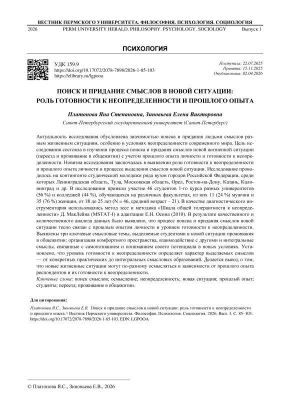 Актуальность исследования обусловлена значимостью поиска и придания людьми смыслов разным жизненным ситуациям, особенно в условиях неопределенности современного мира. Цель исследования состояла в изучении процесса поиска и придания смыслов новой жизненной ситуации (переезд и проживание в общежитии) с учетом прошлого опыта личности и готовности к неопределенности. Новизна исследования заключалась в выявлении роли готовности к неопределенности и прошлого опыта личности в процессе выделения смыслов новой ситуации. Исследование проводилось на контингенте студенческой молодежи ряда вузов городов Российской Федерации, среди которых Ленинградская область, Тула, Московская область, Орел, Ростов-на-Дону, Казань, Калининград и др. В исследовании приняли участие 46 студентов 1-го курса разных университетов (56 %) и колледжей (44 %), обучающихся на различных факультетах, из них 11 (24 %) мужчин и 35 (76 %) женщин, от 18 до 25 лет (N = 46, средний возраст – 21). В качестве диагностического инструментария использовались метод эссе и методика «Шкала общей толерантности к неопределенности» Д. МакЛейна (MSTAT-I) в адаптации Е.Н. Осина (2010). В результате качественного и количественного анализа данных было выявлено, что процесс поиска и придания смыслов новой ситуации тесно связан с прошлым опытом личности и уровнем готовности к неопределенности. Выявлены три ключевые смысловые темы, выделяемые студентами в новой ситуации проживания в общежитии: организация комфортного пространства, взаимодействие с другими и интегральные смыслы, связанные с самопознанием и пониманием своего потенциала в новых условиях. Установлено, что уровень готовности к неопределенности определяет характер выделяемых смыслов — от конкретных практических до интегральных смысловых образований. Делается вывод о том, что новые жизненные ситуации могут по-разному осмысляться в зависимости от прошлого опыта респондентов и их готовности к неопределенности.