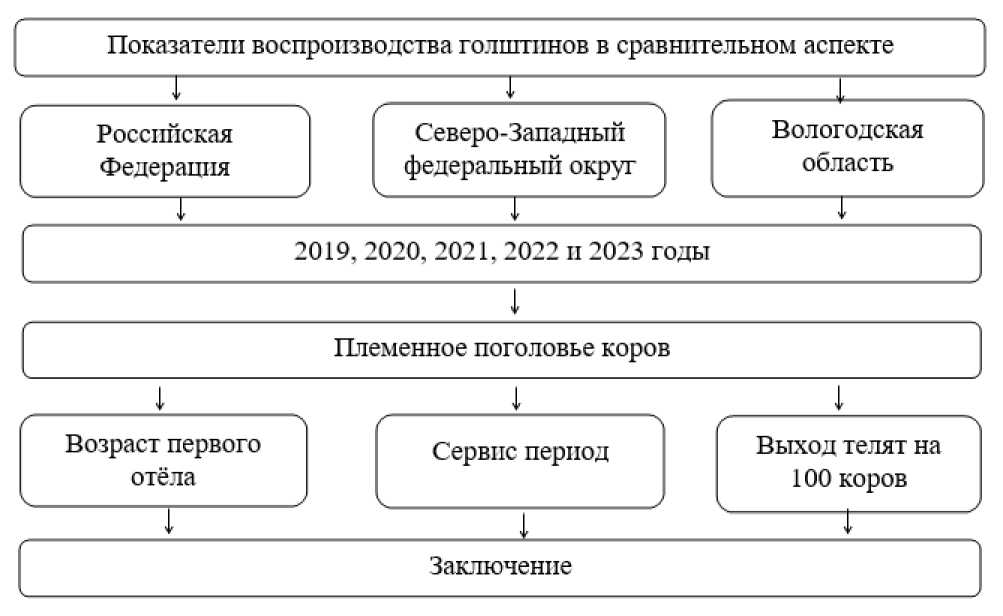 Информационной базой для анализа послужили данные племенного учёта, систематизированные в ежегодных сборниках за пятилетний период (2019-2023 гг.)[19-23]. Объектом изучения выступили три иерархических уровня: национальный (РФ), окружной (СевероЗападный федеральный округ) и региональный (Вологодская область). Ключевыми анализируемыми параметрами стали возраст достижения первого отёла, продолжительность сервис-периода и интенсивность воспроизводства (количество полученных телят в расчёте на сотню коров).