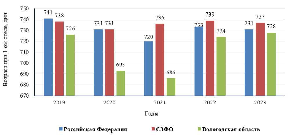 Рисунок 2 – Динамика среднего возраста первого отела племенных коров в РФ, СЗФО и Вологодской области за 2019-2023 годы