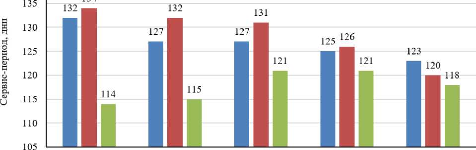 Более детальное изучение данных, представленных на рисунке 3, подтверждает сделанные ранее выводы. На общероссийском уровне фиксируется не просто эпизодическое улучшение, а устойчивая и последовательная тенденция к снижению продолжительности сервис-периода. Начиная с 2019 года, показатель демонстрирует стабильное ежегодное уменьшение и к 2023 году сократился на 9 дней – с 132 до 123 дней. Это свидетельствует о системной работе, направленной на повышение воспроизводства стада в масштабах страны.