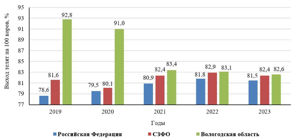 Одним из показателей воспроизводства является выход телят на 100 коров, который выступает важнейшим маркером состояния репродуктивной функции маточного поголовья. В соответствии с рекомендациями Министерства сельского хозяйства РФ, для благополучного ведения отрасли этот показатель не должен опускаться ниже 80 % [24].