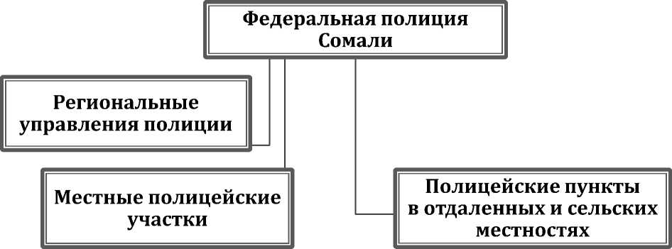 После гражданской войны сомалийское государство формируется по принципу федеративного. При этом динамика сомалийского федерализма такова, что порой очень сложно разобраться в субъектах Сомалийской федерации [10, с. 257–267]. Помимо федеральной полиции, в каждом субъекте Федеративной республики Сомали созданы окружные (региональные) управления полиции, которым непосредственно подчиняются полицейские участки на местах (рис. 2, 3).