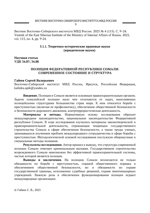 The Results of the Study: The author came to the conclusion that the structure of the modern Somalia police meets criminal challenges. State-building of the revived Somalia is impossible without an effective law enforcement system, of which the police are a part.