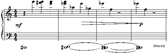 Токката после прелюдии выступает образным контрастом. Свобода и красочность прелюдии резко меняется на яркую механистичную «погоню» звуков, их точно выверенное безостановочное движение. Активная, строгая и безэмо-циональная токката обнаруживает свою логику. Так, тема начинается с одного тона «d» и в ритмических вариантах повторяется 13 раз, после чего обрастает звуками до 12 тонов в симметричной последовательности (d, f, e, g, cis…).