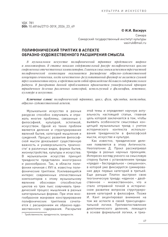 Текст статьи Полифонический триптих в аспекте образно-художественного расширения смысла