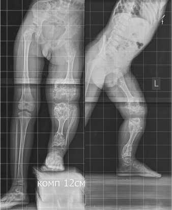 Хондроматозные очаги располагались в области проксимальных и дистальных отделов бедренной и берцовых костей, затрагивая эпиметафизарные зоны и представляя собой утолщенные отделы костей с типичным нарушением минерализации и чередованием участком минерализации и рентгенпрозрачных включений (рис. 1). Функциональные ограничения отражались в снижении способности ходьбы, необходимости посторонней помощи и использовании обуви с большой компенсацией укорочения левой нижней конечности.