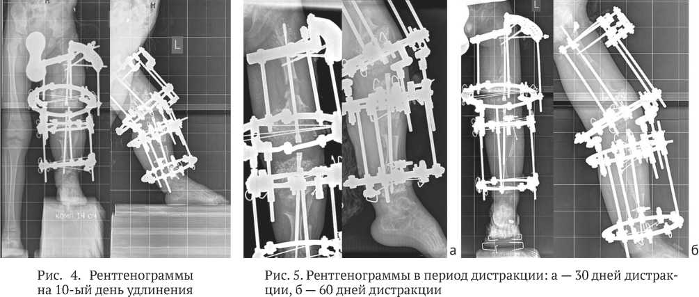 Ближайший послеоперационный период протекал благополучно. Пациент вертикализирован на вторые сутки после операции с посторонней помощью. Через три дня после оперативного вмешательства была начата дистракция на уровне бедра и голени. Заданный исходно темп дистракции был 1 мм в сутки.