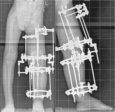 Спице-стержневого аппарат внешней фиксации, состоял из 2 кольцевых опор на голени, и кольцевой опоры в нижней трети бедра и сегментарной короткой дуги в верхней трети сегмента. В дистальной кольцевой опоре бедра и дистальной кольцевой опоре голени применяли лишь спицы диаметром 1,8 мм, проведенные на метафизарном уровне. В проксимальной дуге бедра применяли только стержни-шурупы диаметром 4,5 мм, введенные в проксимальный метафиз, а в проксимальной опоре голени — комбинация спиц и стержня-шурупа, расположенных также на метафизарном уровне (рис. 3). На уровне коленного сустава для соединения опор применяли шарнирные узлы.