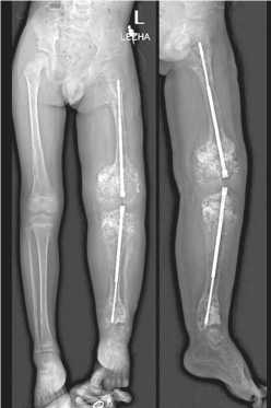Из того же парапателлярного доступа производилось антеградное введение спицы-гида под рентгеновским контролем со входом через межмыщелковую зону по костно-мозговому каналу до уровня деформации в верхней трети большеберцовой кости. Остеотомия на вершине деформации выполнялась из доступа 1 см. Дополнительно в нижней трети голени через разрез кожи до 1 см выполнена остеотомия малоберцовой кости. Далее по спице-гиду производили рассверливание канала канюлированным сверлом диаметром 5,8 мм до дистального метафиза, введение внутренней части телескопического стержня до уровня непосредственно над дистальной зоной роста. Далее следовало введение соответственно укороченной внешней части диаметром 5,5 мм с вкручиванием резьбовой части канюлированной отверткой в проксимальный эпифиз большеберцовой кости, не заходя за линию зоны роста. Заключительным этапом размещения телескопического стержня большеберцовой кости было вкручивание резьбовой части в дистальный эпифиз таким образом, чтобы вся резьба оказалась дистальнее линии зоны роста. Скусывание выступающего отдела внутренней части выполняли непосредственно перед промыванием и послойным ушиванием парапателлярного доступа. Рентгеновский контроль целой конечности подтвердил корректное расположение телескопических стержней (рис. 2).