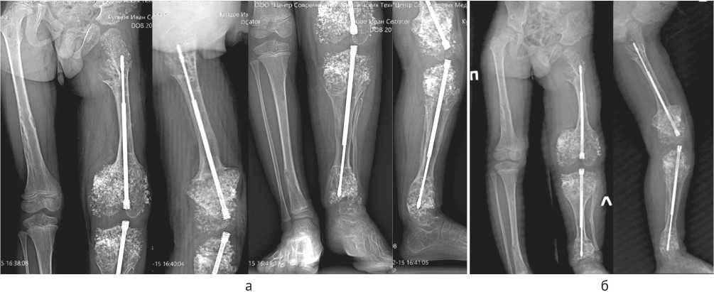Рис. 8. Рентгенограммы через шесть месяцев (а) и 12 месяцев (б) после демонтажа аппарата Илизарова