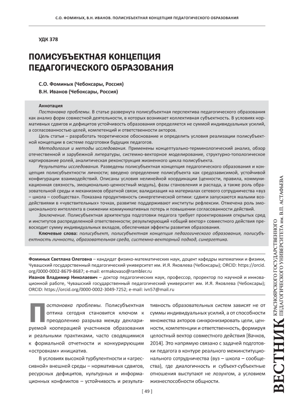 Постановка проблемы. В статье развернута полисубъектная перспектива педагогического образования как анализ форм совместной деятельности, в которых возникает коллективная субъектность. В условиях нормативных сдвигов и дефицитов устойчивость образования определяется не суммой индивидуальных усилий, а согласованностью целей, компетенций и ответственности акторов. Цель статьи – разработать теоретическое обоснование и определить условия реализации полисубъектной концепции в системе подготовки будущих педагогов. Методология и методы исследования. Применены концептуально-терминологический анализ, обзор отечественной и зарубежной литературы, системно-векторное моделирование, структурно-топологическое картирование ролей, аналитическая реконструкция жизненного цикла полисубъекта. Результаты исследования. Разведены полисубъектная концепция педагогического образования и концепция полисубъектности личности; введено определение полисубъекта как средозависимой, устойчивой конфигурации взаимодействий. Описаны условия нелинейной координации (ценности, правила, коммуникационная связность, эмоционально-ценностный модуль), фазы становления и распада, а также роль образовательной среды и механизмов обратной связи; валидизация на материалах сетевого сотрудничества «вуз – школа – сообщества». Показана продуктивность синергетической оптики: сдвиги запускаются малыми воздействиями в «чувствительных» точках, развитие поддерживают институты рефлексии. Отмечена роль эмоционального интеллекта в снижении коммуникативных потерь и повышении согласованности действий. Заключение. Полисубъектная архитектура подготовки педагога требует проектирования открытых сред и институтов распределенной ответственности; результирующий «общий вектор» совместного действия превосходит сумму индивидуальных вкладов, обеспечивая эффекты развития образования.