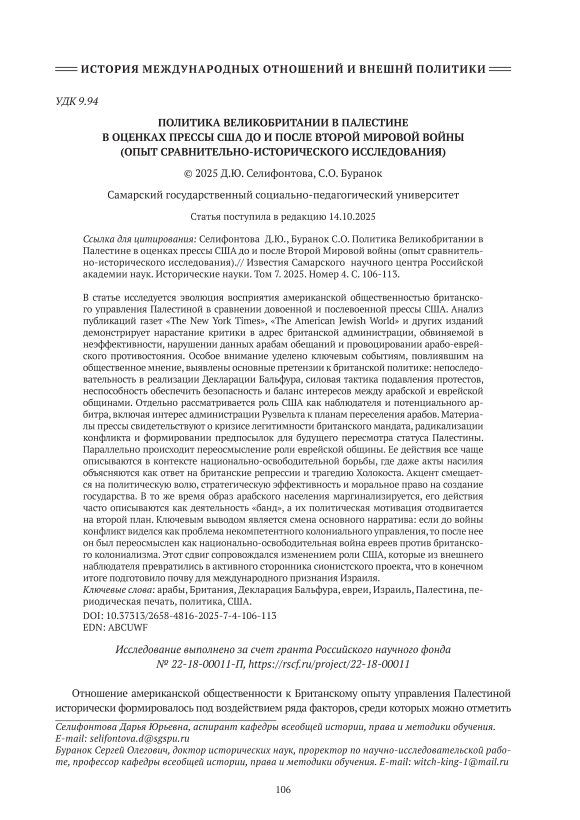 В статье исследуется эволюция восприятия американской общественностью британского управления Палестиной в сравнении довоенной и послевоенной прессы США. Анализ публикаций газет «The New York Times», «The American Jewish World» и других изданий демонстрирует нарастание критики в адрес британской администрации, обвиняемой в неэффективности, нарушении данных арабам обещаний и провоцировании арабо-еврейского противостояния. Особое внимание уделено ключевым событиям, повлиявшим на общественное мнение, выявлены основные претензии к британской политике: непоследовательность в реализации Декларации Бальфура, силовая тактика подавления протестов, неспособность обеспечить безопасность и баланс интересов между арабской и еврейской общинами. Отдельно рассматривается роль США как наблюдателя и потенциального арбитра, включая интерес администрации Рузвельта к планам переселения арабов. Материалы прессы свидетельствуют о кризисе легитимности британского мандата, радикализации конфликта и формировании предпосылок для будущего пересмотра статуса Палестины. Параллельно происходит переосмысление роли еврейской общины. Ее действия все чаще описываются в контексте национально-освободительной борьбы, где даже акты насилия объясняются как ответ на британские репрессии и трагедию Холокоста. Акцент смещается на политическую волю, стратегическую эффективность и моральное право на создание государства. В то же время образ арабского населения маргинализируется, его действия часто описываются как деятельность «банд», а их политическая мотивация отодвигается на второй план. Ключевым выводом является смена основного нарратива: если до войны конфликт виделся как проблема некомпетентного колониального управления, то после нее он был переосмыслен как национально-освободительная война евреев против британского колониализма. Этот сдвиг сопровождался изменением роли США, которые из внешнего наблюдателя превратились в активного сторонника сионистского проекта, что в конечном итоге подготовило почву для международного признания Израиля.